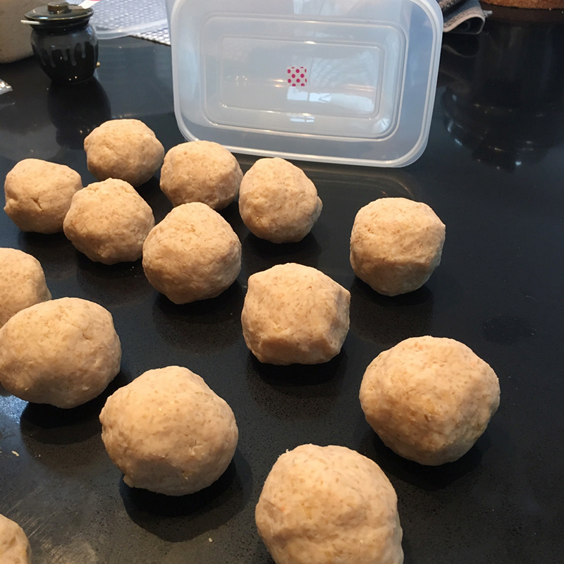 シンプルな配合の小さな丸パンを6個、計量から焼き上げまで講師と一緒に作業していきます。